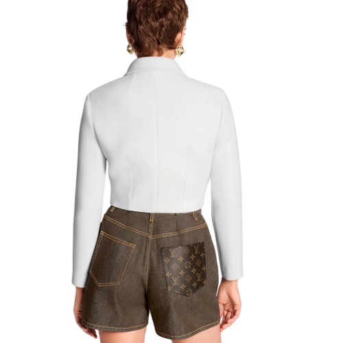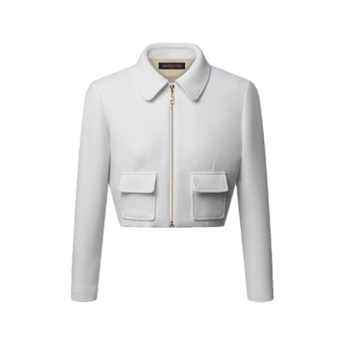 This jacket has a smart, sophisticated air in double wool crepe crafted in a trim, cropped shape emphasized with darting around the waistline. A smart collar and two mini flap pockets introduce a structured detail, while the exposed golden zipper completes the look with a chic metallic accent.