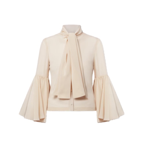 This blouse exudes romance with fluid lines. It is crafted from soft, airy silk crepe de chine in a sophisticated shade for elevated styling. Flared sleeves add graceful volume to the straight-cut silhouette, while the neckline is finished with breezy lavalliere ties. A discreet Monogram canvas top button completes the look with an understated signature.