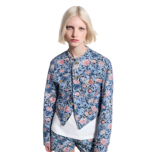 This jacket makes a chic statement in this season’s romantic floral vine jacquard. The casual style is reworked with a pointed hem at the front and a martingale at the back inspired by formal dress codes, while two flap pockets add a structured touch to the chest. Golden hardware completes the look with a polished detail.