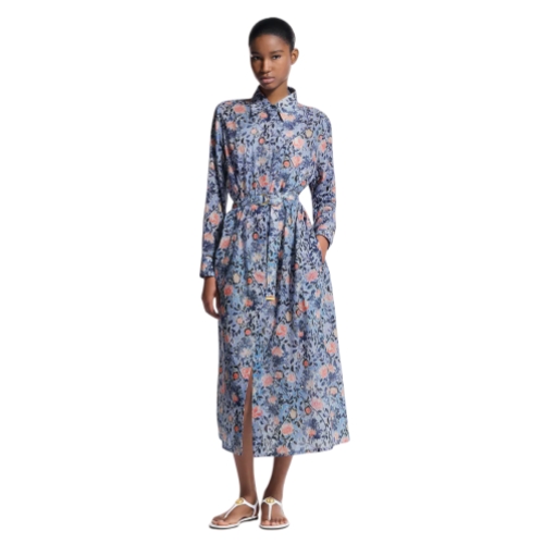 This shirt dress has a fresh, romantic spirit in lightweight cotton voile featuring an allover print of this season’s signature floral vine motif. It is cut in a clean, full-length shape with long sleeves, a hidden button tab and a smart collar, while a coordinating D-ring belt accentuates the waistline for a flattering silhouette.