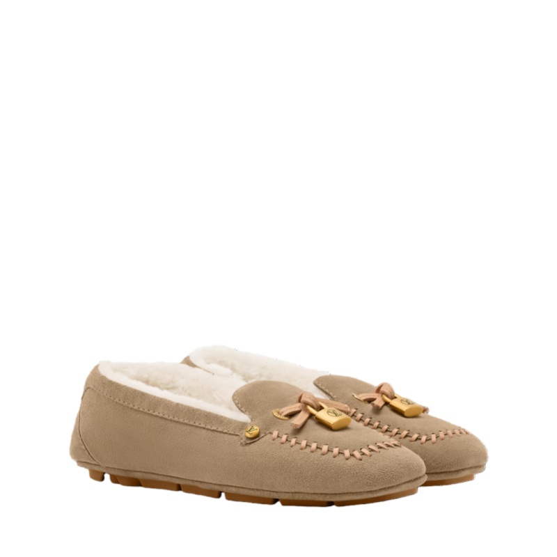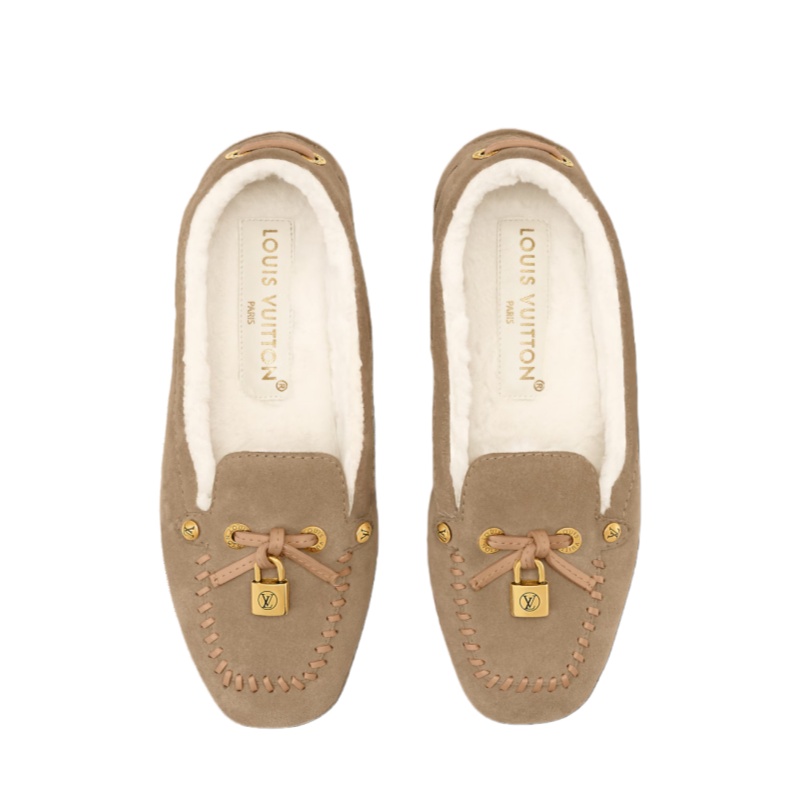 Part of the LV Ski capsule, this winter-ready version of the Flore car shoe combines an upper in suede calf leather with a cozy shearling lining. This lightweight, comfortable model is notable for its refined details, including natural leather laces and an engraved padlock in gold-toned metal. It is finished with a supple, rubber-pad outsole.