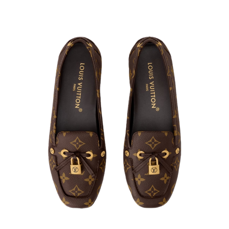 This iteration of the Flore car shoe is crafted from Monogram grained calf leather, which replicates the look of Monogram canvas. This relaxed yet stylish model is notable for its refined details, including engraved studs, eyelets and a padlock accessory, all in gold-toned metal. It is finished with a rubber-pad outsole for lightness and flexibility.