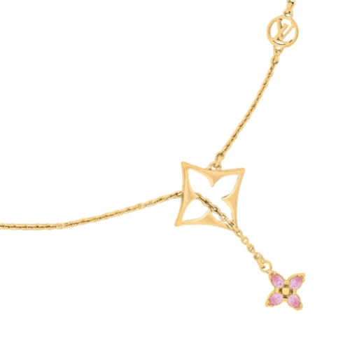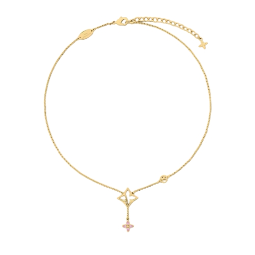 The strikingly elegant design of the Flowergram Strass necklace is a tribute to the House’s heritage and craftsmanship. Its fine-linked gold-colored chain is adorned with an array of Louis Vuitton icons, including an LV Circle emblem and two Monogram Flowers. Colorful rhinestones add a touch of ultra-feminine sparkle to this refined, eye-catching necklace.