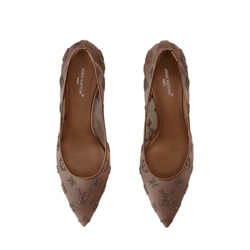 The Gala pump is an elegant, evening-ready style in mesh embroidered with sparkling rhinestones, which form the iconic Monogram pattern. The sleek lines of the upper are complemented by a slender stiletto heel, while the fine leather outsole is embellished with an LV Initials accessory in gold-toned metal.