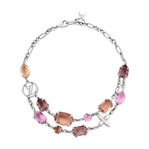 The creative, romantic design of the Heirloom necklace features a striking interplay of colors, materials and proportions. Its finely crafted palladium-toned chain is adorned with colorful zircons held in place by minutely detailed Monogram Flower claws. LV Circle and Monogram Flower charms add an extra House signature to this enchanting, sophisticated necklace.