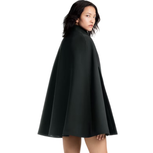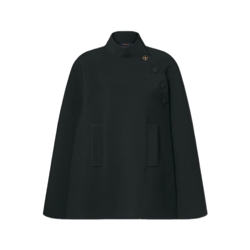This understated cape coat is crafted from wool-silk cady crepe in a clean silhouette with a high collar. The asymmetrical opening is fastened with four buttons, one of which is signed with the iconic LV Initials. The front is finished with two slit pockets, while the inside is discreetly signed with a Monogram silk lining.