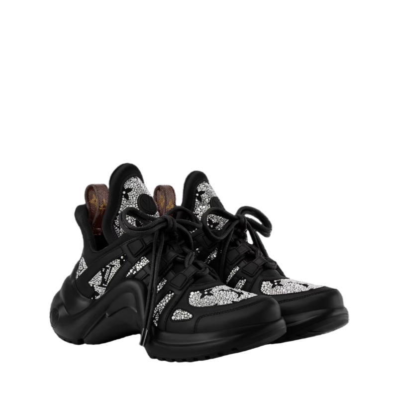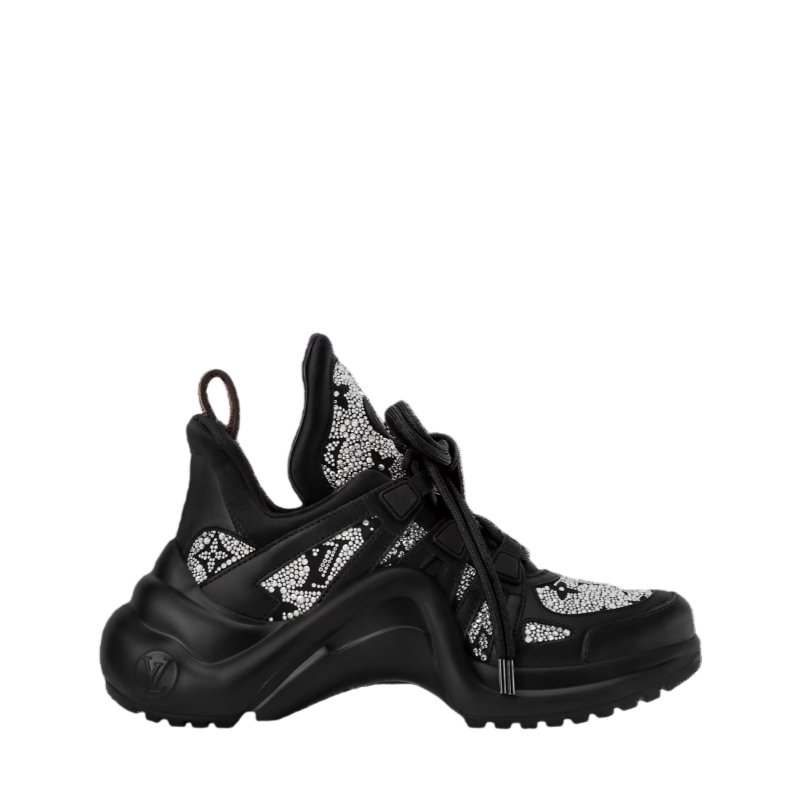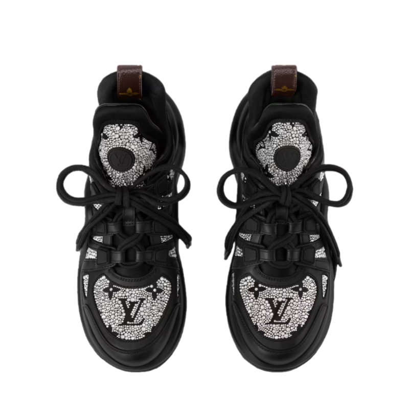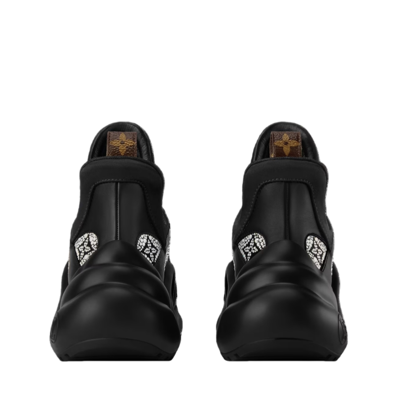 This exceptional edition of the LV Archlight sneaker is covered in glittering rhinestones recreating the Louis Vuitton Monogram pattern. The bouncy, wave-shaped outsole, which is a key feature of this cult design, comes in black rubber for an elegant look. Both the tongue and outsole are signed with an LV Circle motif.