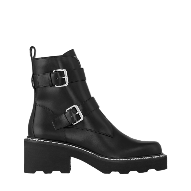 The LV Beaubourg ankle boot in smooth calf leather is notable for its two straps with engraved, silver-tone buckles, which give it an assertive, biker-inspired look. This model is notable for its chunky heel and lightweight micro outsole, which are highlighted by contrast stitching. The Louis Vuitton signature is embossed on the tongue.