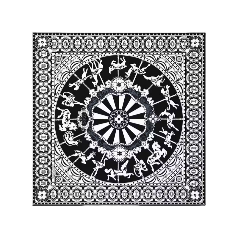 The refined and feminine LV Carrousel square features an intricate design infused with whimsical childlike charm. Expertly printed on pure silk, it depicts an enchanting carousel accented with subtle references to the iconic Monogram pattern. A Louis Vuitton signature border adds an extra House touch to this sophisticated, elegant accessory.
