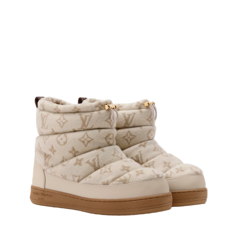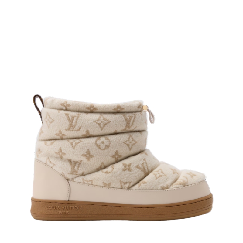 Part of the LV Ski capsule, the LV Cloud ankle boot sneaker is crafted from soft cashgora wool woven with the Monogram pattern. Calf-leather trim complements this cozy, padded model, which is easy to slip on and off thanks to an elastic lace with a gold-toned stopper at the ankle. The slip-resistant rubber outsole bears the Louis Vuitton signature.