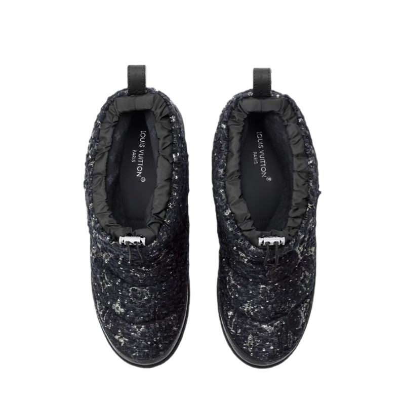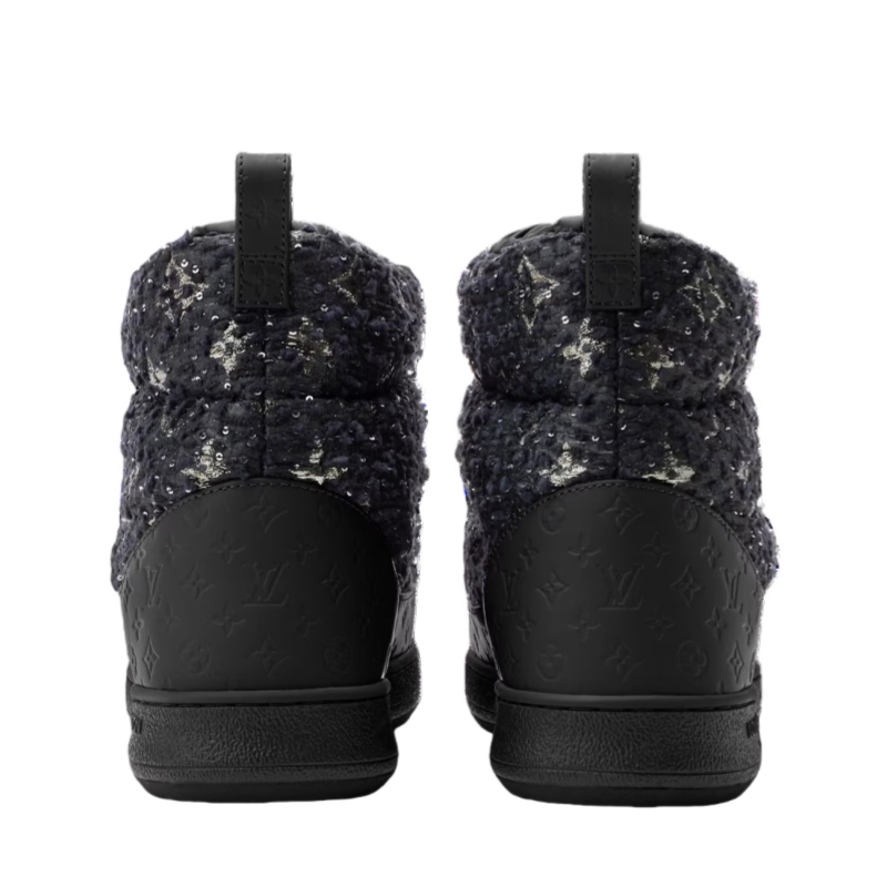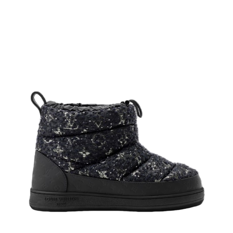 This glamorous edition of the LV Cloud ankle boot sneaker pairs shimmering Monogram tweed with rubberized calf leather debossed with the Monogram pattern. Part of the LV Ski collection, this comfortable, padded model is ideal for both après-ski and winter in the city. It is mounted on a rubber outsole with the Louis Vuitton signature.