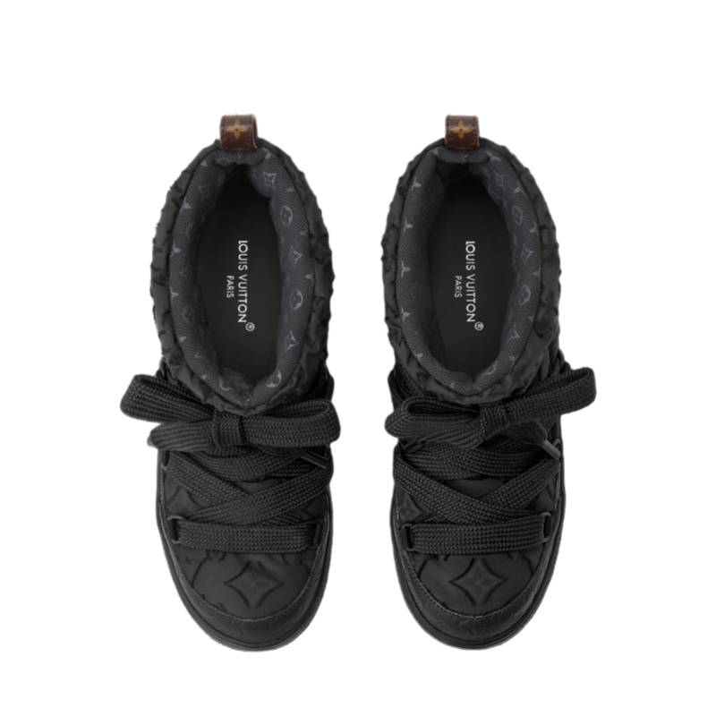 This refined interpretation of the LV Cloud lace-up ankle boot sneaker coordinates with the season's Ready-to-Wear collection. On the nylon upper, the Monogram pattern is revealed by a fil coupé technique, while it is also embossed on the rubberized calf-leather trim. The tone-on-tone rubber outsole and laces complete this design for a chic, all-black look.