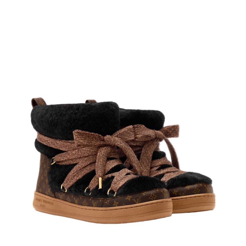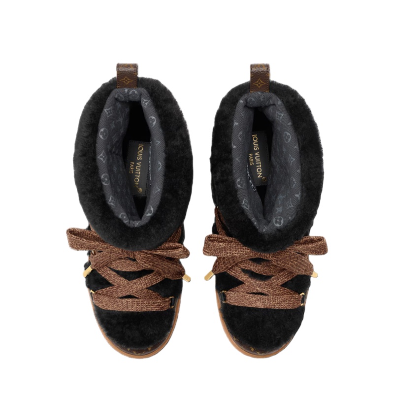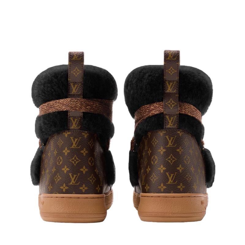 The LV Cloud lace-up ankle boot sneaker teams snug shearling with iconic Monogram canvas for warmth, comfort and a striking signature look. This stylish model, which belongs to the LV Ski capsule, will transition effortlessly from the slopes to city streets. It features crisscrossing laces with gold-toned eyelets and a rubber outsole with the Louis Vuitton signature.