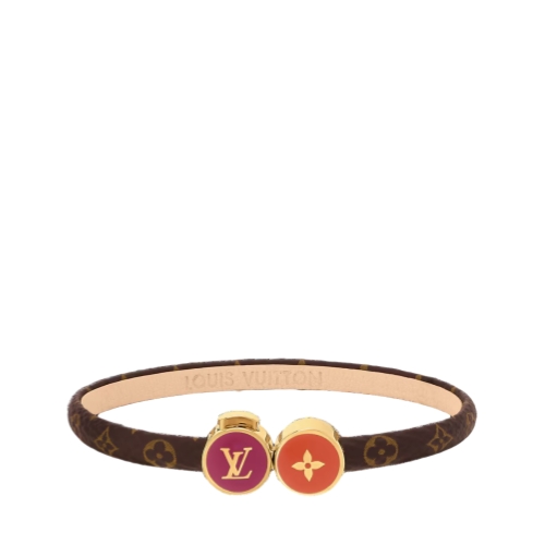 The casual-chic LV Confetti bracelet offers an eye-catching variation on the House’s beloved icons. Its Monogram canvas strap features a colorful metal and enamel closure in the form of two confetti-like disks adorned with a Monogram Flower and the emblematic LV Initials. This fun, easy-to-wear bracelet adds a playful creative accent to any look.