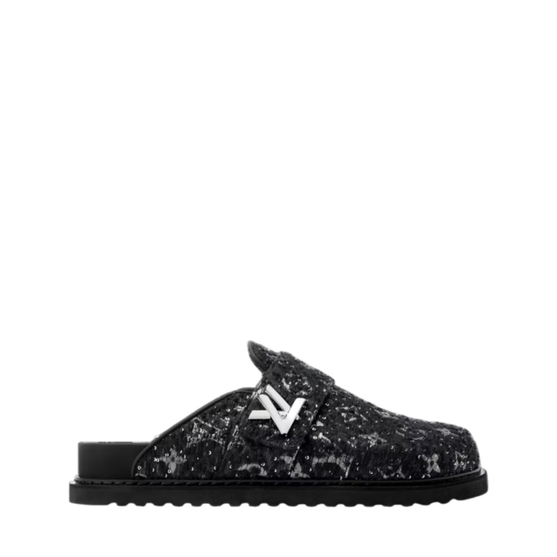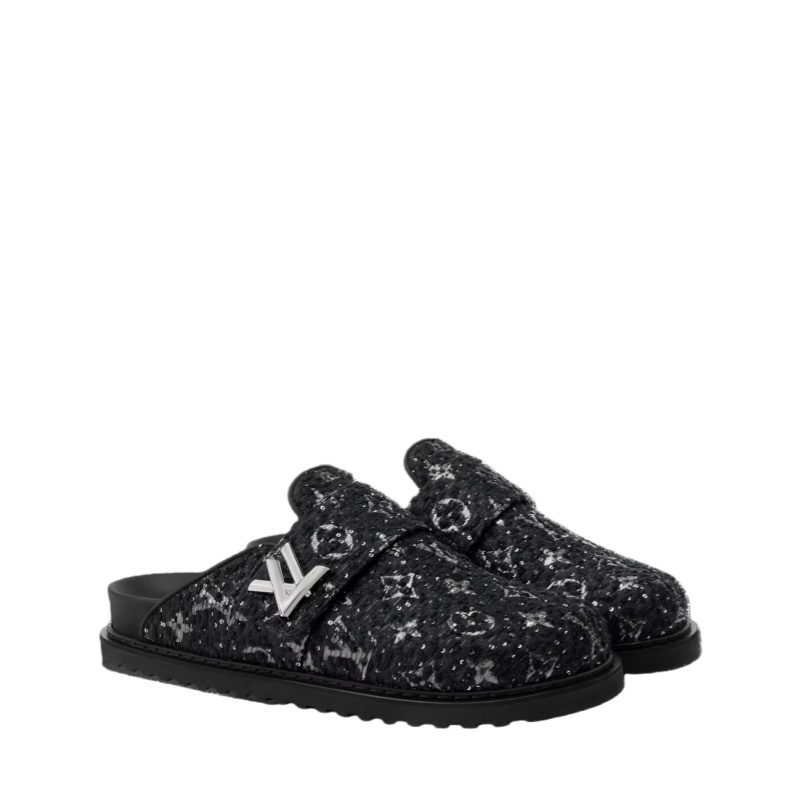 As part of the LV Ski capsule collection, the LV Cosy comfort clog is revisited in shimmering Monogram tweed for a relaxed yet glamorous look. The upper is signed with an LV Twist accessory in silver-toned metal. This effortless, slip-on style is finished with a comfortable anatomic insole and a lightweight micro outsole.
