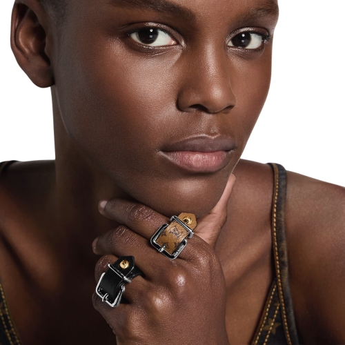 The LV Emblem ring set is a celebration of the iconic Louis Vuitton signatures. It offers two rings modeled after the House’s elegant belts, styled in leather and Monogram Reverse canvas with a trunk-style rivet. With their palladium-colored buckles, these adjustable rings can be worn on any finger, alone or stacked, for an edgy fashion-forward effect.