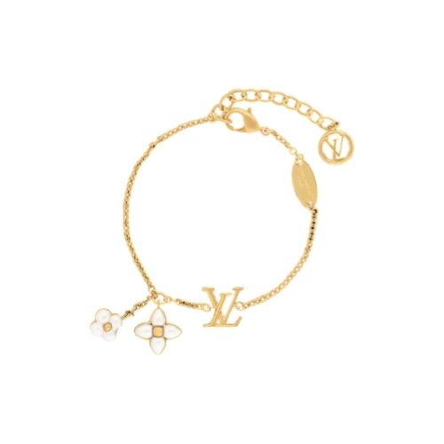 The pared-down design of the LV Floragram bracelet expresses a distinctive House signature. Its gold-colored chain, mixing different-sized links for a creative asymmetrical effect, is accented with an LV Initials charm and two Monogram Flowers. This eye-catching bracelet enlivens the wrist with an aura of feminine elegance.