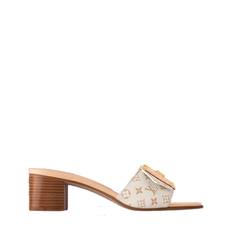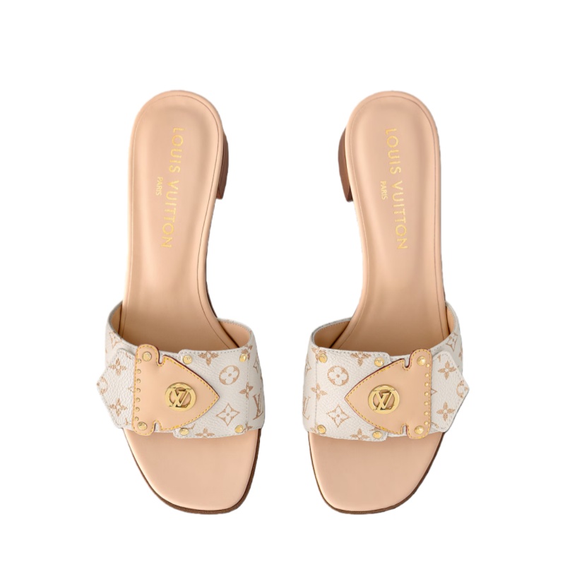 The LV Frame mule is a relaxed yet elegant style in Monogram canvas. Its front strap is embellished with a distinctive detail inspired by the Camera Box bag: a natural leather flap accessorized with gold-toned studs and an LV Circle signature. A low block heel and leather outsole complete this design.