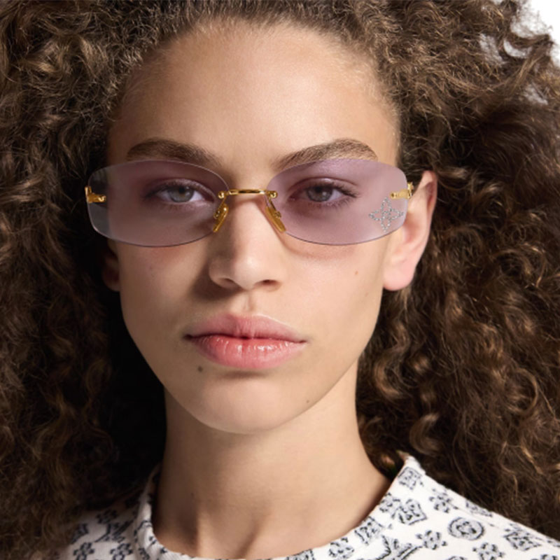 With their colorful lenses and refined shape, the LV Glam Oval sunglasses are a genuine showstopper. Their on-trend rimless design features slim, curved temples in gold-colored metal incorporating the LV Initials. A rhinestone Monogram Flower on the left lens adds a playful feminine touch, echoed by Monogram Flower signature engraving on the end tips.