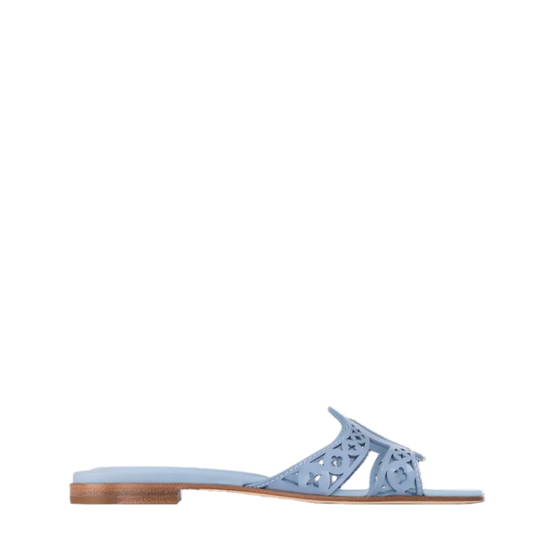 The LV Isola flat mule is revisited this season in patent calf leather with intricate Monogram Flower perforations. The key detail of the LV Isola line is the large LV Circle signature on the strap, which is cut out of the leather. This casual-chic style is finished with a fine leather outsole.