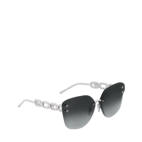 Delicate rimless lenses combine with bold chain-effect temples to give the LV Jewel Cat Eye sunglasses their unique look. Classic House signatures are revealed in subtle details throughout this pair. The iconic LV Initials are incorporated into the chain link design while hand-polished Monogram Flower studs adorn the smoky gradient lenses.