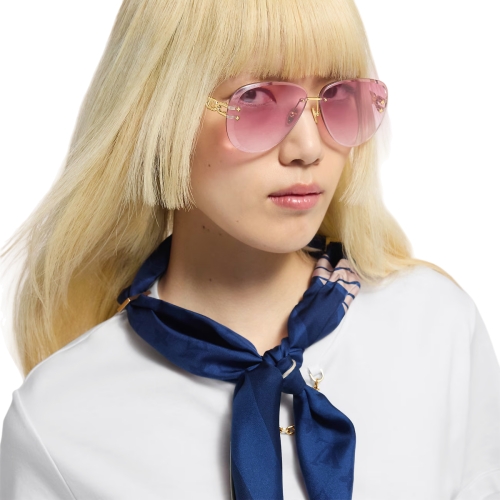 The LV Jewel Pilot sunglasses feature rimless, faceted lenses accentuated by iconic House motifs. Noteworthy elements include the signature chain design on the temples, complete with embedded LV Initials and Monogram Flowers. Gold-toned hardware and Monogram Flower studs on the gradient lenses complete this sleek pair.
