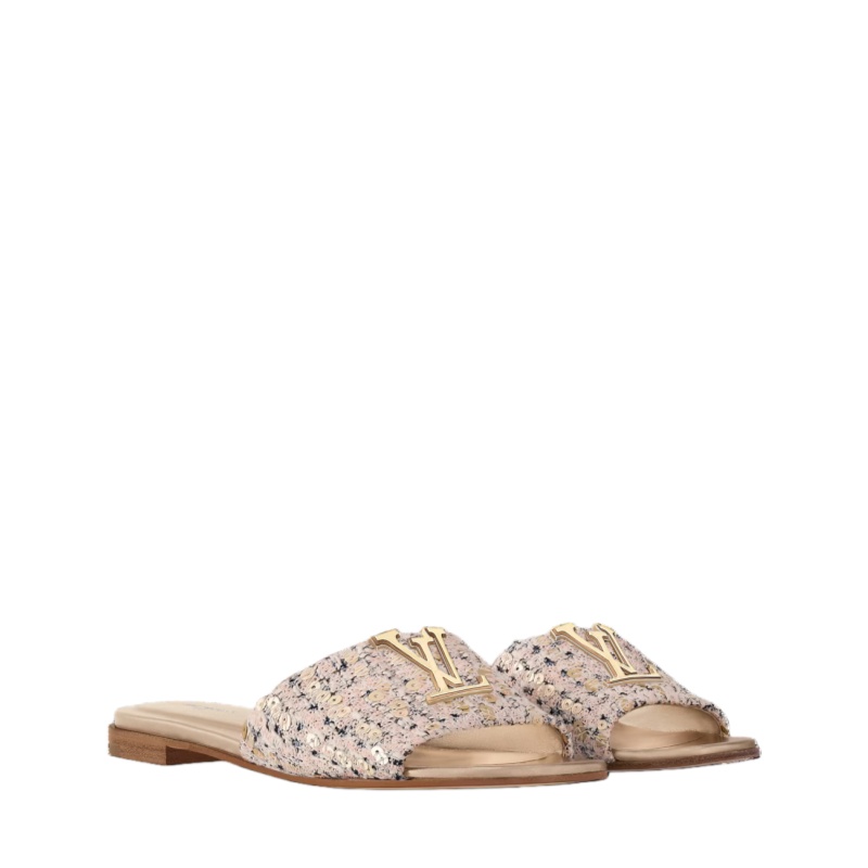 The LV Mare flat mule is revisited this season in shimmering, sequin-embellished tweed, reflecting a key theme of the Louis Vuitton Cruise 2025 collection. This relaxed yet refined model is distinguished by its wide front strap, which is signed with an LV Initials accessory inspired by the clasp of the House's iconic Capucines bag.