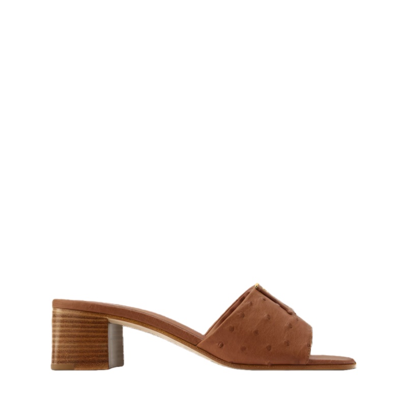 Ostrich leather with a distinctive matte finish complements the refined design of the LV Mare mule. Both elegant and easy to wear, this model comes on a low block heel. The wide front strap is embellished with an LV Initials signature in leather and gold-toned metal, which references the emblematic Capucines bag.