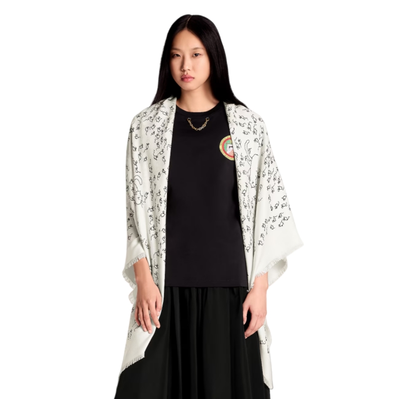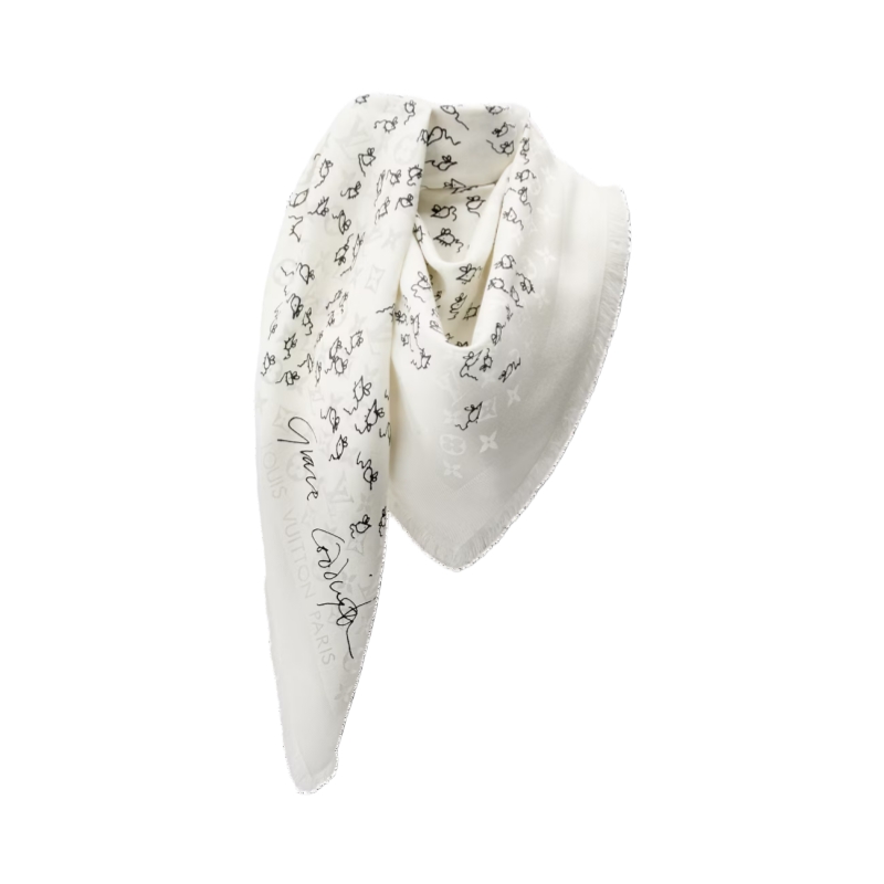 As part of her exclusive collaboration with Louis Vuitton, the stylist and fashion icon Grace Coddington created the pattern for the LV Mice Monogram Classique shawl. Against a jacquard-woven Monogram background, a whimsical print of playful mice showcases Grace’s talent as an illustrator. Crafted in a sumptuous silk-wool blend, this comfortable, elegant shawl adds an original creative touch to any look.