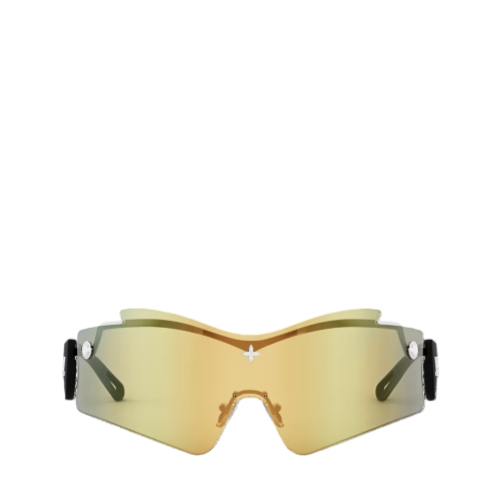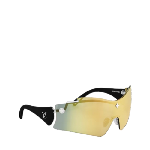 The sporty style of the LV Mirror Mask sunglasses lent an avant-garde aura to Nicolas Ghesquière’s Spring-Summer 2025 Cruise show. The sculptural shape of their mirrored lens is combined with ultra-comfortable rubber-finish temples accented by LV and Monogram Flower signatures in gold-toned metal. Trunk-style studs and a Monogram Flower on the lens add a final House flourish.