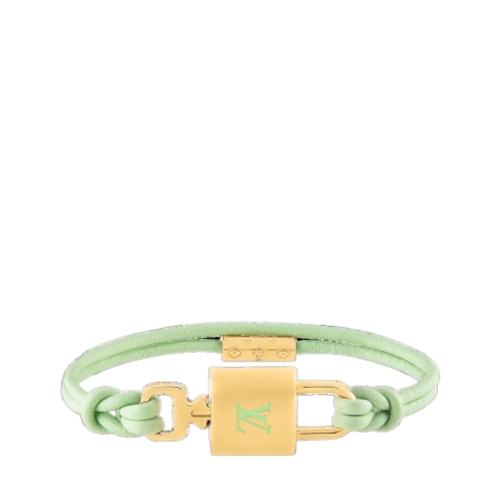 The LV Padlock bracelet pays homage to the House's trunk-making history. A padlock featuring an engraved LV signature sits at the center, held securely in place by a Monogram canvas strap. A removable key opens the bracelet, giving the piece a special yet functional touch.