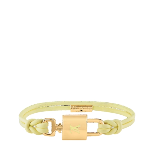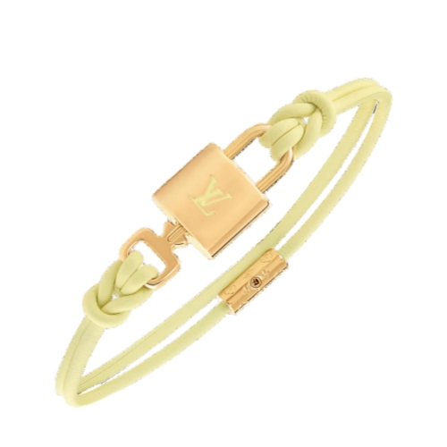 The LV Padlock bracelet pays homage to the House's trunk-making history. A padlock featuring an engraved LV signature sits at the center, held securely in place by a Monogram canvas strap. A removable key opens the bracelet, giving the piece a special yet functional touch.