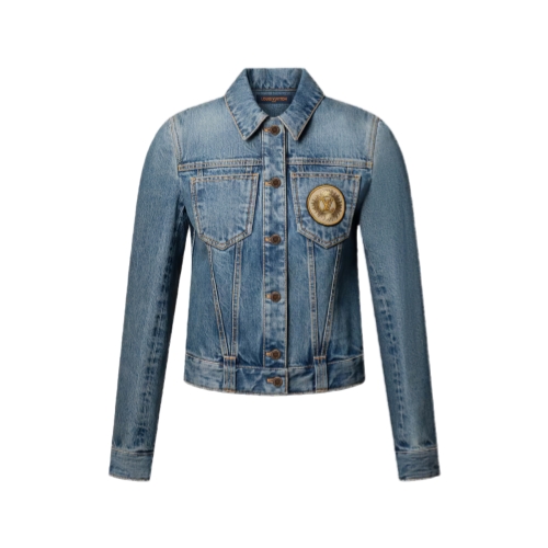 This jacket is a timeless staple in washed denim detailed with yellow topstitching to highlight the construction. It is cut in a straight shape with a collar and two chest pockets, one of which is embellished with a seasonal LV sun patch. A Monogram canvas accent adds a final signature to the back of the waistband.