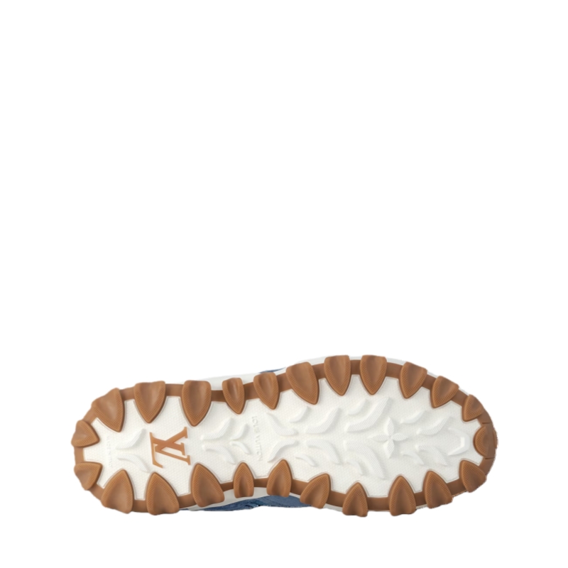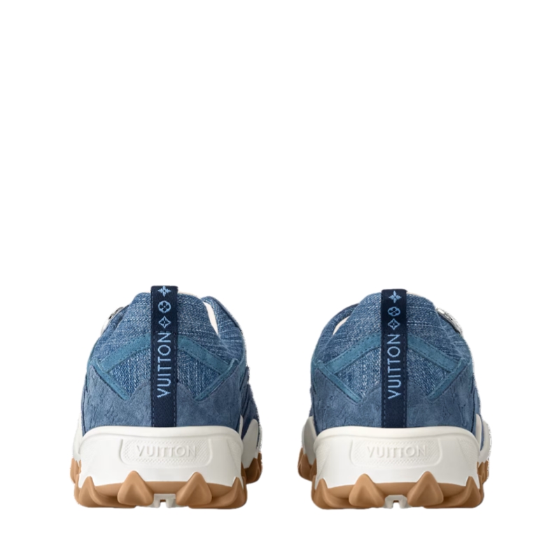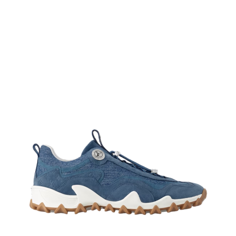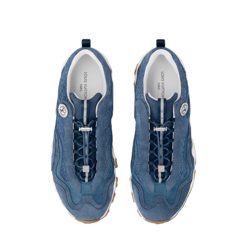 The sporty aesthetic of the LV Rush sneaker is complemented by a stylish combination of denim and Monogram-debossed suede calf leather. Designed by Women's Artistic Director Nicolas Ghesquière, this model is characterized by its distinctive wave-shaped outsole. Other key details are the elastic laces, Louis Vuitton reflective loops and silver-toned LV Circle accessory on the side.