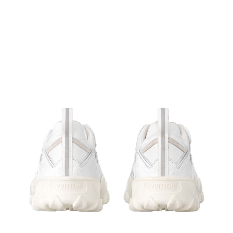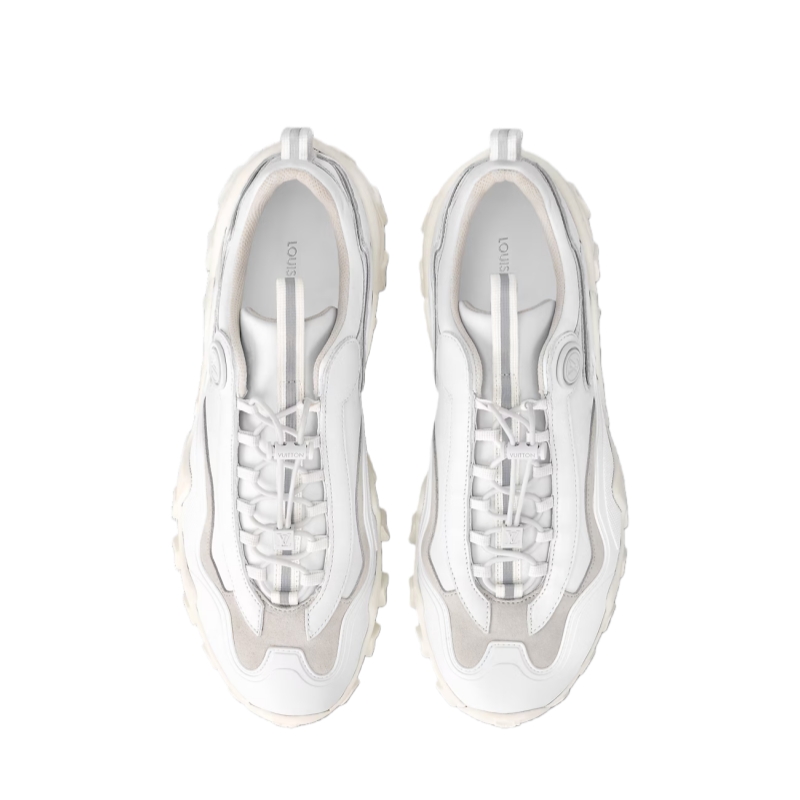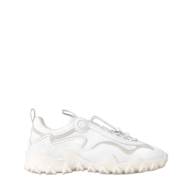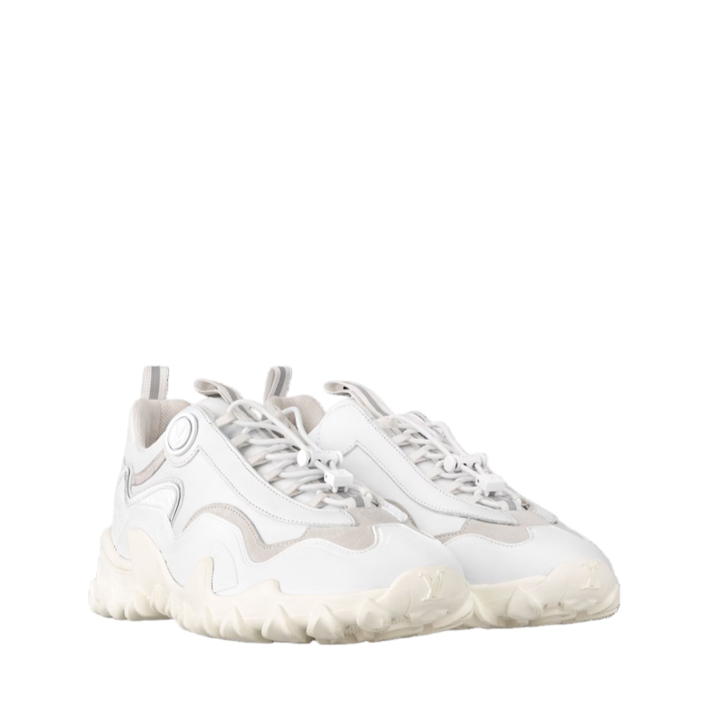The LV Rush sneaker comes in a mix of materials, including plain, suede and rubberized calf leather. Seen at the Cruise 2024 show, this model was designed by Artistic Director Nicolas Ghesquière, who was inspired by vintage boxing shoes and running shoes. Key features include the metal LV Circle accessory on the side and the wave-patterned outsole.
