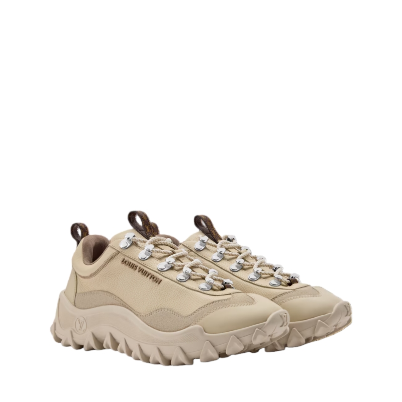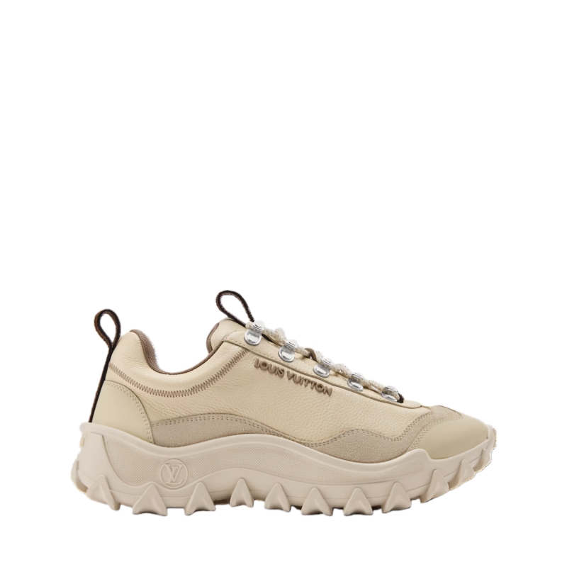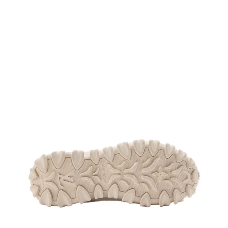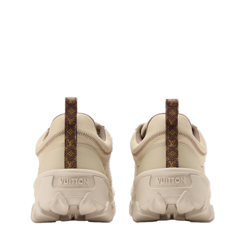 The LV Rush Xplorer sneaker comes in supple, grained calf leather with details in suede and rubberized leather. This model is characterized by its chunky yet lightweight outsole with a distinctive wavy design and an LV Circle signature. The upper is complemented by technical laces and Monogram-canvas loops at the front and back.