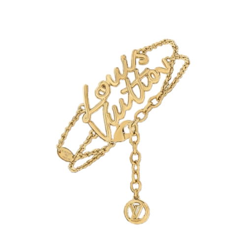 Crafted in lustrous gold-toned metal, the LV Script bracelet features a new Louis Vuitton signature showcased as the backdrop of the Spring-Summer 2025 fashion show. Its distinctive design comprises a double row of fine chain links framing the House’s name in sleek, flowing script. Worn alone or stacked, it adds a charming touch of glamour to any outfit.