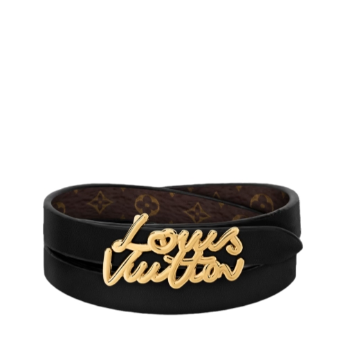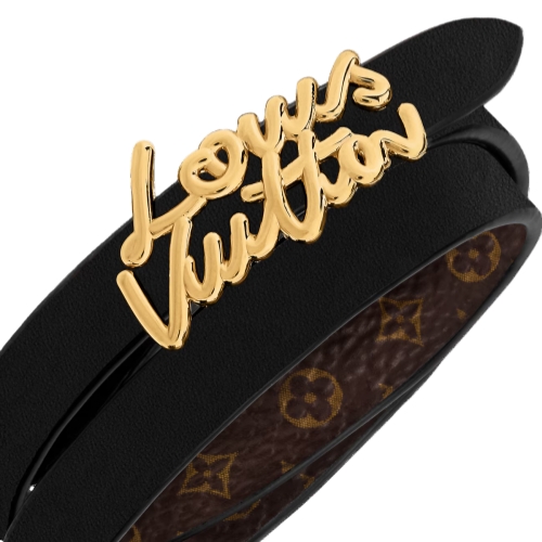 The LV Script bracelet evokes the House’s heritage in a sleekly contemporary design. Its smooth leather strap is accented with a script-style Louis Vuitton signature in gleaming gold-colored metal. Expressing elegant simplicity, this refined bracelet is an ideal companion for both casual and formal outfits.