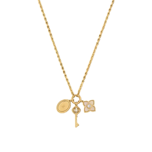 Inspired by the House’s rich history, the LV Signet necklace is a fusion of prestigious heritage and contemporary style. Suspended from a delicate gold-colored chain, a trio of enchanting charms evoke the spirit of Louis Vuitton: a key, a Monogram Flower and a finely detailed LV Circle signet. An elegant, on-trend jewel, and a distinctive statement piece.