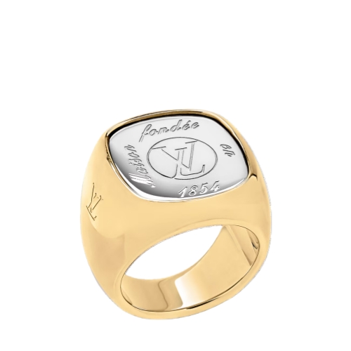 The distinctive design of the LV Signet ring offers an original blend of contemporary elegance and timeless heritage. Its chunky gold-toned band is adorned with a palladium-colored signet inspired by the LV Circle emblem, meticulously engraved with historical details. This precious ring expresses a strong identity rooted in the House’s rich history.
