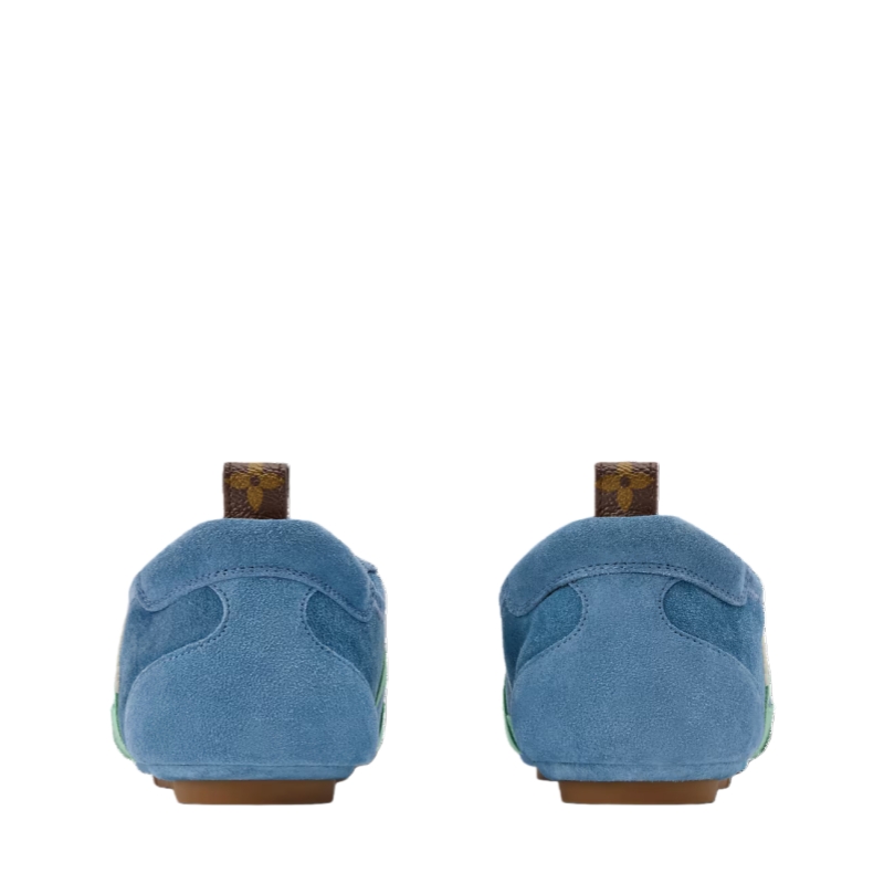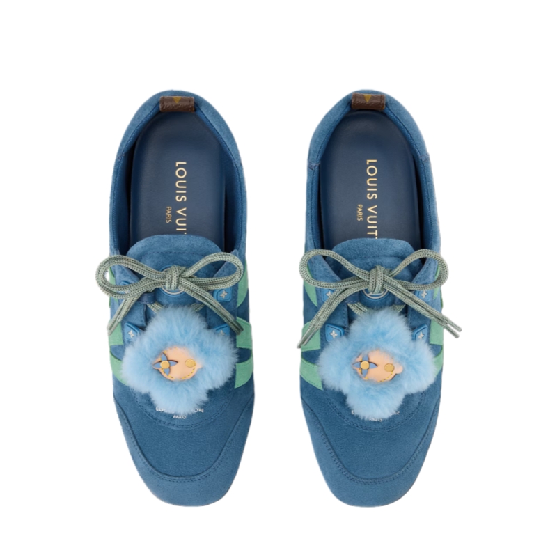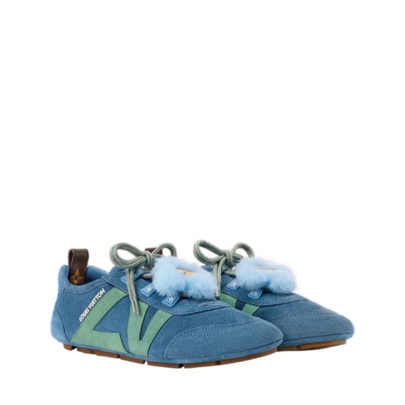 This edition of the LV Sneakerina sneaker ballerina is made of soft suede calf leather. Its laces are embellished with a delightful accessory: a fluffy tag representing the House's Vivienne mascot. This model, a sleek combination of a sneaker and a ballet pump, features a supple sacchetto construction and a lightweight injected TPU outsole with signature details.