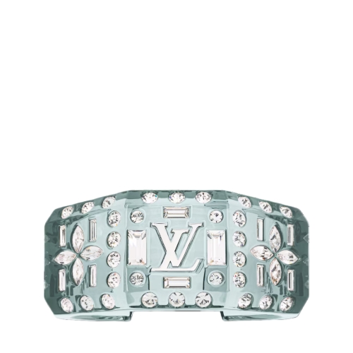 A veritable ode to happiness and self-expression, the LV Sparks bangle was inspired by the radiant hues of the summer sky. Crafted in colorful, translucent resin, its geometric form is punctuated with dazzling rhinestones that catch the light with every gesture. The LV Initials and Monogram Flowers add a sophisticated House signature to this elegant contemporary jewel.