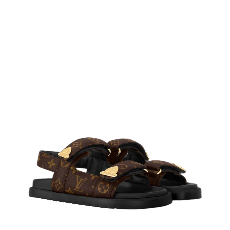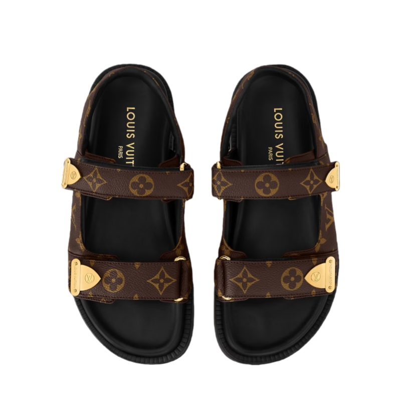 The LV Sunset comfort sandal comes in iconic Monogram canvas. This relaxed style is characterized by its two adjustable velcro straps, which are embellished with distinctive metal details inspired by trunk corners and engraved with House signatures. A padded anatomic footbed and lightweight rubber outsole make this model exceptionally pleasant to wear.