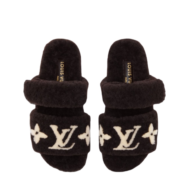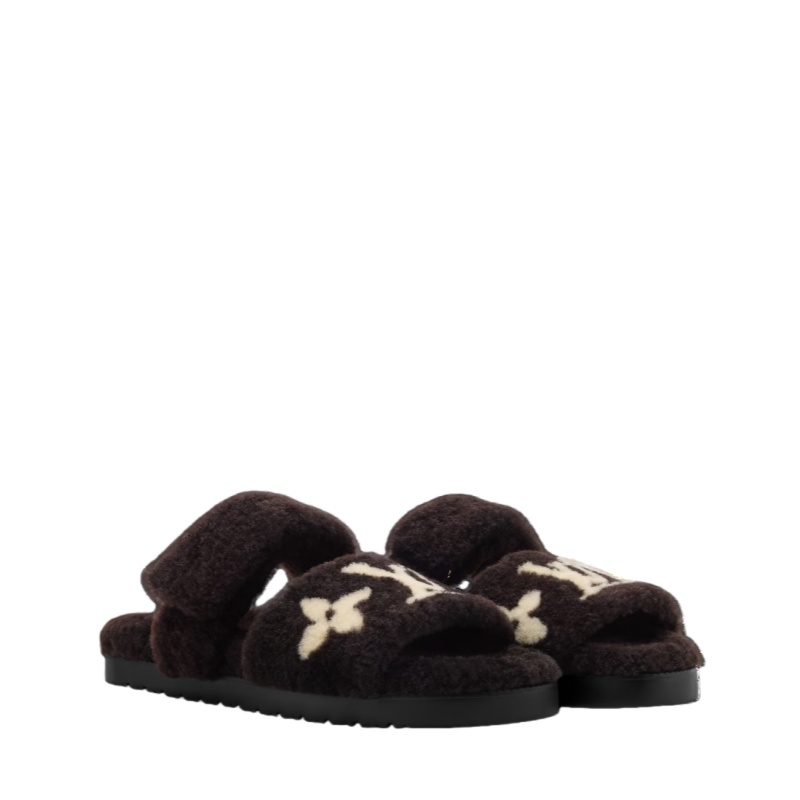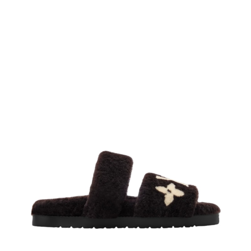 This winter-ready edition of the LV Sunset comfort mule is made of soft, warm shearling, which also covers its anatomic footbed. The front strap is decorated with contrasting intarsia signatures: the LV Initials and Monogram Flowers. Exceptionally comfortable to wear, this model comes on a lightweight rubber outsole.