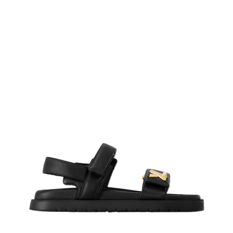 The LV Sunset flat comfort sandal comes in soft, grained calf leather. Combining style with comfort and practicality, this model features an anatomic footbed and two adjustable, padded straps. The front strap is embellished with a chunky LV accessory in gold-tone metal, which was inspired by the clasp of the iconic Twist bag.