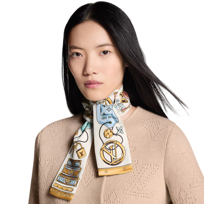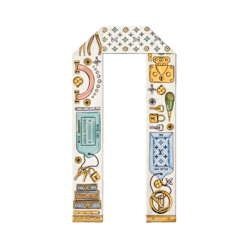 The richly detailed design of the LV Tool Box bandeau is a creative tribute to the House’s heritage of craftsmanship and innovation. Printed on pure silk, it combines delicate tool motifs with evocations of historic Louis Vuitton trunks. An allover Monogram pattern on the reverse side adds a final signature flourish to this refined, elegant bandeau.