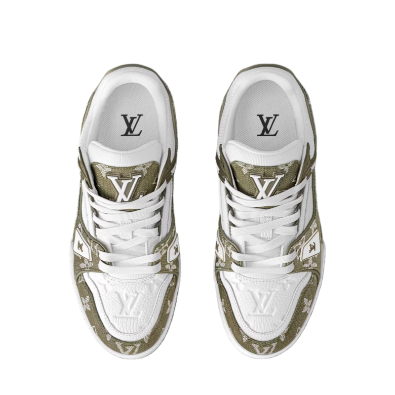 For the first time, the cult LV Trainer sneaker, a staple of the men's collection, is revisited for women in calf leather and Monogram denim. This classic design, created by Virgil Abloh, references vintage basketball sneakers. It features numerous signature details, including the LV Initials on the tongue and side, and Monogram Flowers on the outsole.