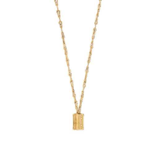The distinctive design of the LV Trunk necklace showcases the House’s luggage-making heritage with contemporary flair. Suspended from a gold-toned keyhole link chain, its intricately detailed pendant depicts a vintage-style Louis Vuitton trunk. An elegant necklace to be worn as a talisman, infused with the spirit of travel and adventure.