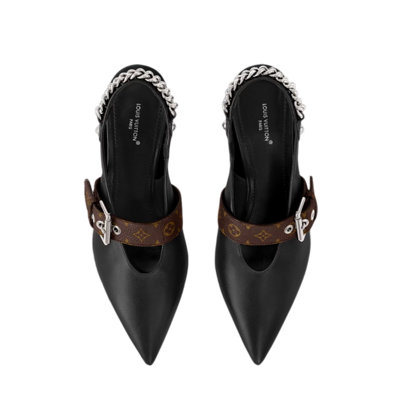 The sleek design of the LV Vibe slingback pump is complemented by soft lambskin. This model is notable for its pointed toe and high, leather-covered heel, as well as for its distinctive details: a decorative, belt-like strap in Monogram canvas at the front and a silver-toned chain and engraved studs on the elasticized back strap.