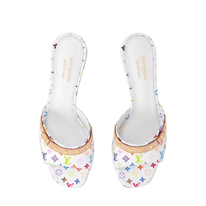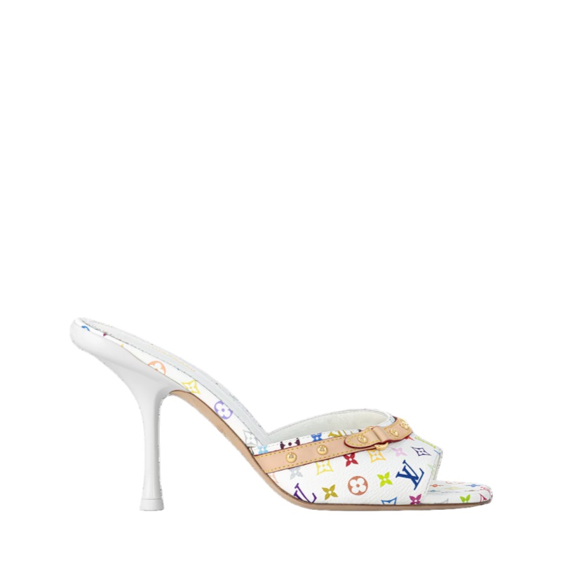 The 6AM mule is effortlessly sophisticated in a slender stiletto silhouette. A multicolored Monogram motif from the re-edition of the Louis Vuitton x Murakami collection adds a playful allover signature inspired by the Japanese artist’s vibrant aesthetic, while the wide front strap is detailed with a slim natural cowhide leather trim studded with gold-toned hardware for a rebellious finishing touch.